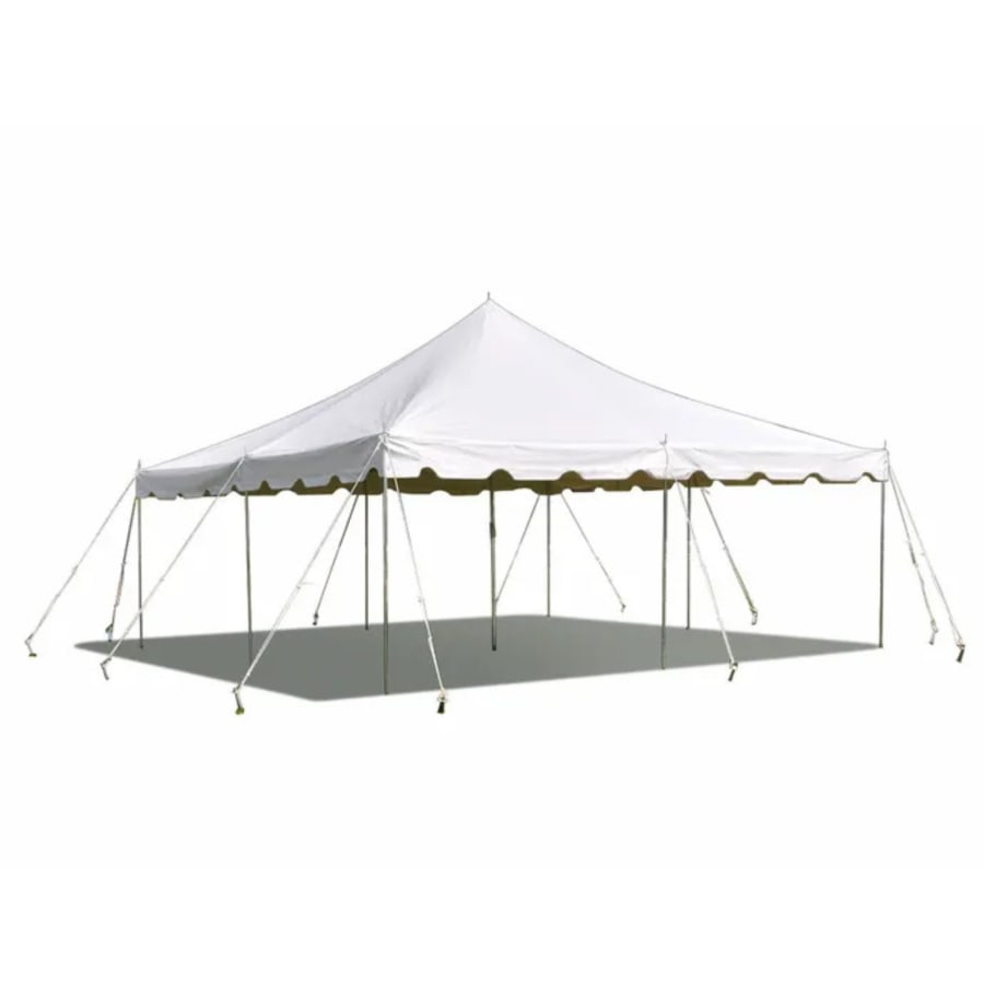 Our 20x20 Pole Tent is the perfect choice for outdoor events, offering both style and reliable coverage. This spacious tent comfortably accommodates up to 40 guests for a seated event or around 50 guests for a casual gathering. Supported by sturdy center poles and secured with stakes, it provides a classic, elegant look ideal for backyard parties, weddings, graduations, or corporate events.